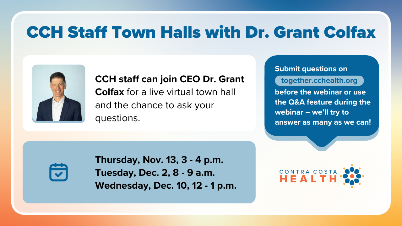 CCH Staff are invited to join Dr. Grant Colfax for a live virtual town hall and the chance to ask your questions.